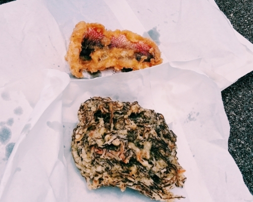 魚、もずく、イカなどの海の幸を注文してから揚げるので、すこ~しだけ待つかもしれませんが、それでも観光客だけではなく地元のお客さんにも大人気だとか。 1個60円なのでおやつ代わりにサクサク食べられちゃう感じです。