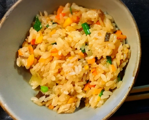 豚バラ肉や人参、ひじきなどの具が入った沖縄風の炊き込みご飯。和風出汁に豚バラ肉のコクが加わっているのが特徴。冠婚葬祭などでふるまわれることも多いそうですが、観光客は沖縄そばのお店で出会うことも多いです。