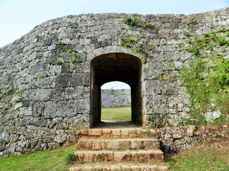 築城年は不明ですが、アーチ型の美しい石門と、まるで南米の遺跡のような荘厳な石段が特徴的です。中城王子(琉球王国の皇子)の居城や中城村役場としても使われていました。