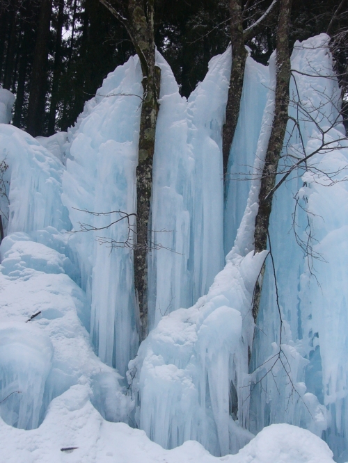 冬には凍り付いた「たるまの滝」の他、周辺の木々に水を散布して作り上げた「氷のオブジェ」を見られます。
