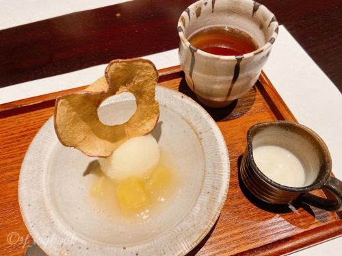 自分でわさびを擦ってお料理に添えていただきます。かつて塩の道と呼ばれていただけあり、海の幸、山の幸が両方取り入れられたお料理がならびます。デザートも長野らしく、りんごをあしらったシャーベットです。