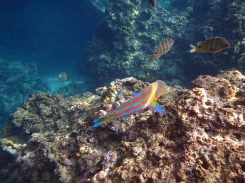 駐車場より海へと向かい、いよいよシュノーケルがスタートです。青の洞窟までは、10分程度泳ぎます。海の中はカラフルなお魚たちの楽園です。