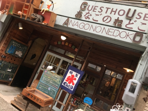 間口が狭く奥に長い町屋づくりの古民家を利用して、空き家再生プロジェクトにより作られたゲストハウス、その名もあなごのねどこ。尾道本通り商店街の中央街にあり、畳敷きにちゃぶ台と座布団という純和風の室内は、日本好きの外国人にはヨダレもの。大人気だそうです。