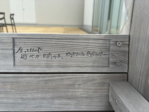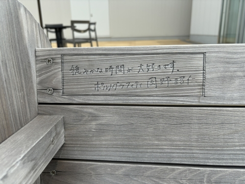 ミツイシヤ最寄り駐車場の一つに指定されている「因島総合支所」は、ポルノの聖地巡礼の場所でもあり、3階の展望デッキのベンチに、ポルノのお二人のメッセージが書いてあるベンチが♪