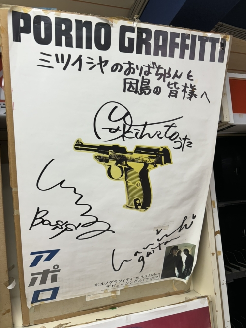 昭和レトロな建物の店内は、ポルノ一色で、これまで販売されてきたCDやDVD、ポルノのお二人と店主の方が映った写真も展示されています。