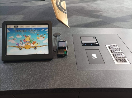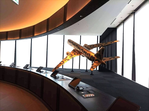 金色に輝くホテルのロゴ付きの飛行機の模型の前には、セルフチェックイン用のタブレットがずらりと並んでいます。台数が多いので、混雑時も待たされる心配はありません。やり方は難しくありませんが、スタッフもいて助けてくれるので安心です。