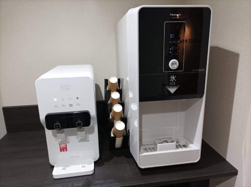 通常、お水のペットボトルが備えられているホテルが多いですが、備え付けのお水では足りなかったり、スタッフに電話をかけて氷を持ってきてもらったりしなければならないことがあります。でも「OMO 関西空港 by 星野リゾート」にはこのようなステーションがあるので、自分に必要な分だけお水や氷をいただくことができ、とても便利です。