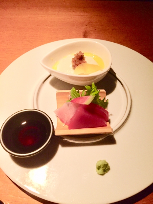 • 写真:トラベルライター【造里】本日の鮮魚2種(マグロとブリ)と濃厚豆乳のすくい生とうふ~胡桃味噌のせ~