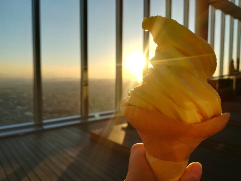 あべのハルカスのキャラクター「あべのべあ」がプリンのお風呂に入っているかのような可愛らしいプリンや、カリカリ食感のパインアメがおいしい地元会社とのコラボ商品「パインアメソフトクリーム」など、天空庭園でしか食べられないオリジナルメニューが特におすすめです。