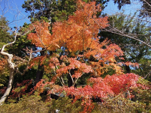 弘川寺の境内には多くのモミジやドウダンツツジが植えられており、例年11月上旬から11月下旬頃まで紅葉が楽しめます。境内でも人気が高い紅葉スポットは、本堂西側の庭園です。この庭園は、後で紹介します本坊庭園の一部で、赤や黄に染まるモミジがトンネルのようにも見え、大変美しいです。