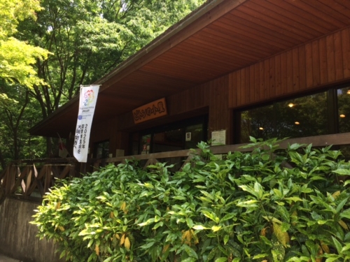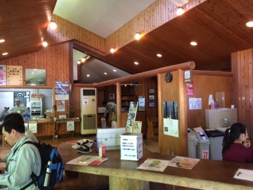 山小屋風の案内所です。わからないことは、こちらの係の方に聞くことができます。中には、机やイス、自動販売機があります。こちらで飲み物の補充を行うといいでしょう。また、展示スペースもあり、子ども達にも挑戦できるロッククライミングのミニ体験ゾーンもあります。お手洗いは隣接しています。