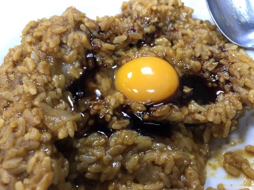 テーブルの脇に、名物カレーのおすすめ(作家の織田作之助好み)の食べ方が3ステップで記載されています。テーブルの上にあるウスターソースをかけて、卵とご飯をかき混ぜて食べるのがよいそうです。 クミンの風味が強く感じられる、独特の風味だったように思います。