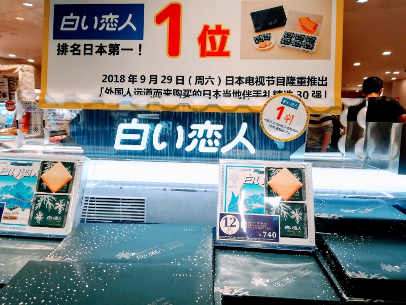 セレクトショップの通りに面した場所に堂々と陳列されているのが、白い恋人。中国語で書かれていることもあってか、中国人が群がっておりました。