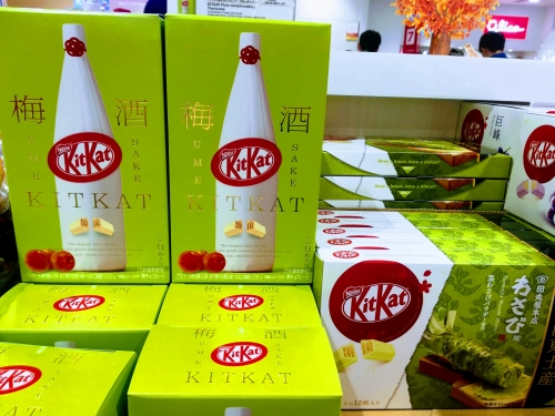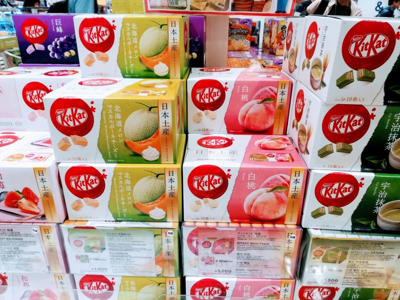 ブドウ、メロン、桃、抹茶、わさびのキットカットがズラリと陳列されています。何味かパッケージに描かれているので、受け取る方が外国人でもわかりやすくて親切です。箱の大きさは通常のキットカットサイズです。