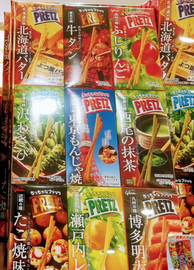 小さなプリッツが6種類入って1セットになっています。北海道バター、東北の牛タン、東海の沢わさび、東京もんじゃ、関西のたこ焼き、博多明太子など、味の全国制覇もできてしまうプリッツ。日本全国のいろんな味が楽しめていいですね。