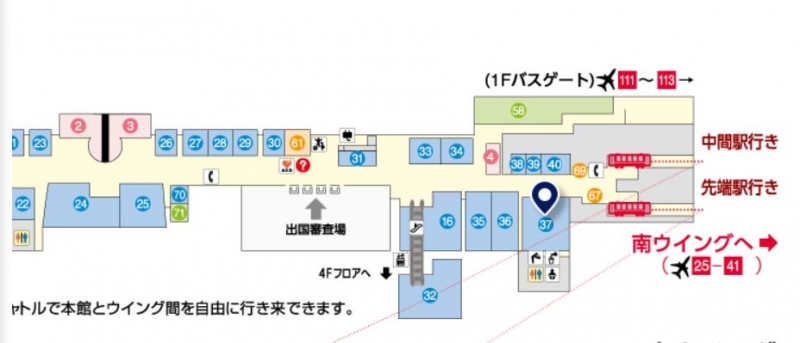 関西国際空港のターミナル1の3F、セキュリティチェック後の国際線出発エリアにあります。本館の南ウイングに行く駅のすぐ近くです(上の写真の地図37番)。
