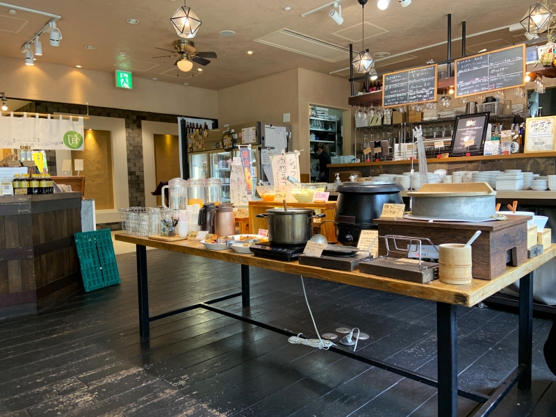 ランチには、サラダビュッフェが付いています。お店の入口付近に用意されているので、いただいてみましょう。こちらには、ご飯、シェフのまかないスープのほか、ちょっとしたおかずやコーヒーなどのドリンクも置かれています。