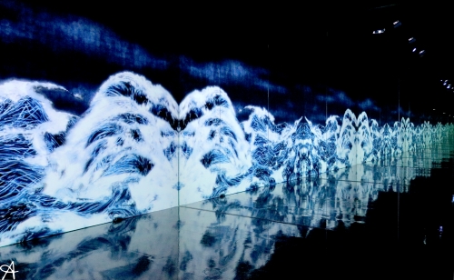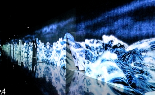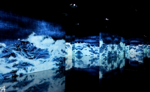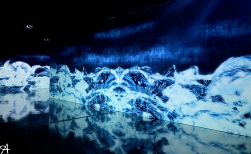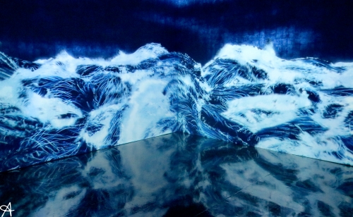壁に投影された波の映像が鏡と床面にも映り、何倍にも増幅されています。実際の展示室の広さの何倍もの広さに感じられます。