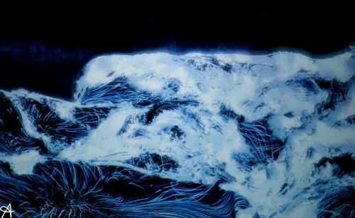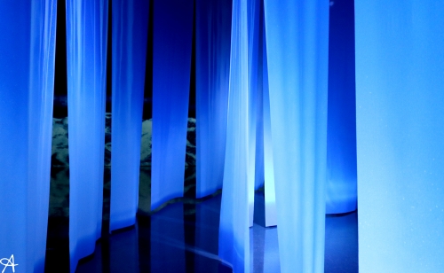 「滝」は展示室の奥にあります。涼しげに時折揺れる滝の展示は、ダイナミックな「波」の展示に対して、静かで繊細な雰囲気です。とてもシンプルですが、眺めていて飽きのこない作品です。