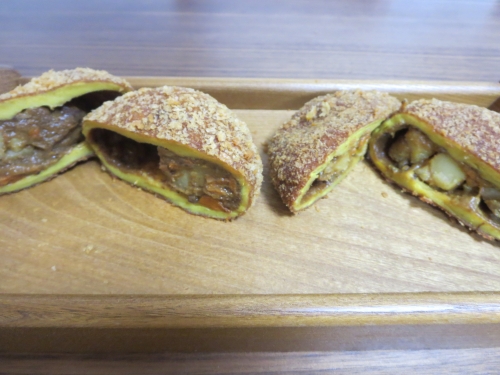 パン生地にもカレーパウダーが練りこまれているので、封を開けた瞬間から食欲全開です。一口目はカリッとしていますが、パン生地にタピオカ粉が練りこんであるそうで、食べ進めるとモッチリ!大きくカットされた野菜と濃いめのルーが美味しいので、どんどん食べ進めちゃう♪