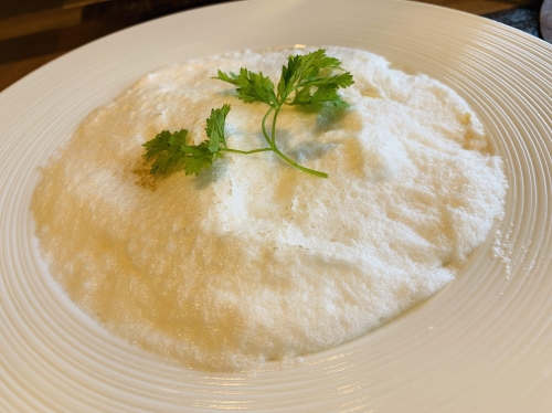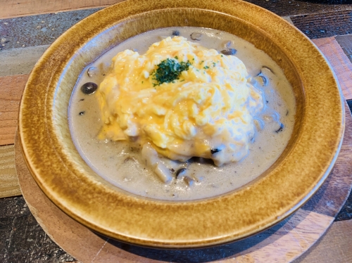 オムライスは、トロトロの卵とポルチーニのミルキーな味わいが最高です。また、カルボナーラはまるで「雲海」のようなふわふわな口当たり。上のメレンゲ部分を割ると、真黄色の卵に包まれたカルボナーラが姿を見せてくれます!中に入っている厚切りのベーコンも、非常にジューシーな味わいです。