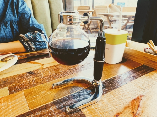 カフェメニューも充実しています。写真左が「オリジナルブレンド サイフォンコーヒー(580円)」、写真右が「ロイヤルミルクティー(580円)」です。