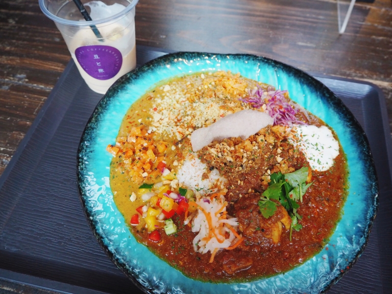 世界を旅した店主こだわりの本格派で、3種のスパイスカレーの上に9種のトッピングがのった盛りだくさんの一皿!いろいろな味が複雑にミックスされていてとってもおいしいです。セットで芥川珈琲さんのコーヒーがいただけます。