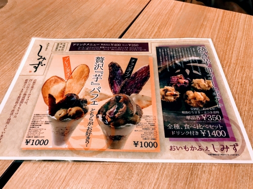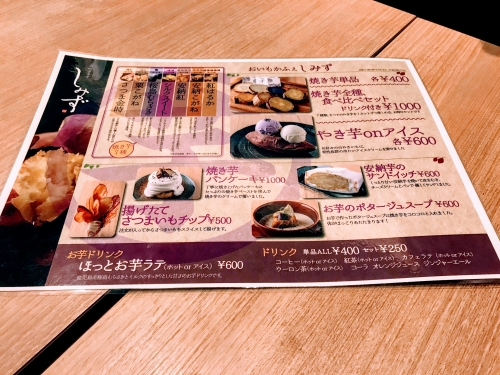 先ほどの写真の格子の手前側には、お会計カウンターと、この写真のような「テイクアウトメニュー」もあります。店内で食べることのできる高級な焼き芋や、各種芋菓子を持ち帰りできるので、時間がない際や、店内が混んでいるときは嬉しいですね♪