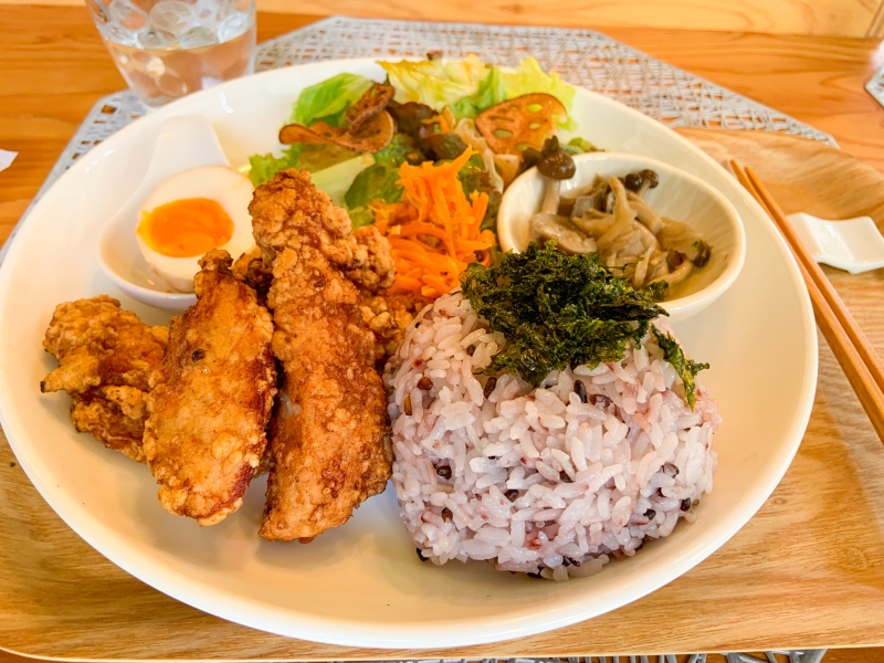 スイーツやドリンクを色々と揃えていますが、お昼には週替わりのランチ(1,100円)もいただけます。筆者が訪れた際には、メイン料理が醤油こうじの鶏ムネ肉の竜田揚げか、国産サーモンとほうれん草のクリーム米粉パスタから選ぶことができたため、竜田揚げを注文しました。