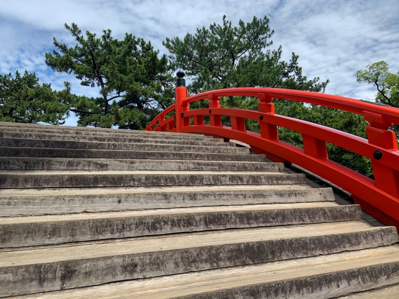 鳥居をくぐって進むと、反橋が見えてきます。住吉大社のシンボルともいえる橋で、太鼓橋とも呼ばれています。少し急な橋なので、ゆっくり慎重に渡ってください。この橋の左右には、楽に渡ることができる橋もかかっています。