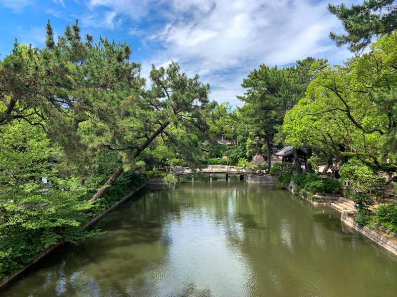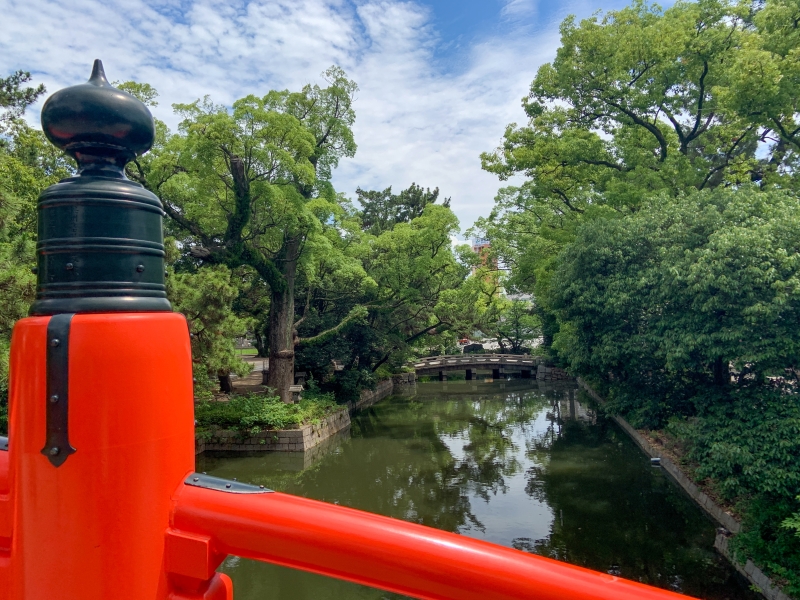 橋の上からは、池や境内の樹木が眺められます。市街地にありながら、緑が多く、ホッとできる景観が魅力です。