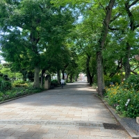 公園の中央を通る広い道は汐掛け道(しおかけみち)と呼ばれており、かつては住吉大社の参道でした。大きな樹木がある通りは、普段は人も少なく、落ち着いた雰囲気です。ベンチが置かれ、散歩途中に休憩したり、読書をして過ごされている人の姿も見られます。