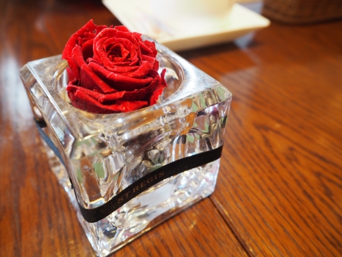 もちろん冷たいドリンクだけではありません。テーブルには温かい飲み物のドリンクメニューもありますよ。セルフではなくオーダー形式です。もちろん飲み放題!いちごブッフェは冬~春に開催なので、温かい飲み物は本当に嬉しいです。テーブルには、大人っぽいバラの飾りが添えられています。