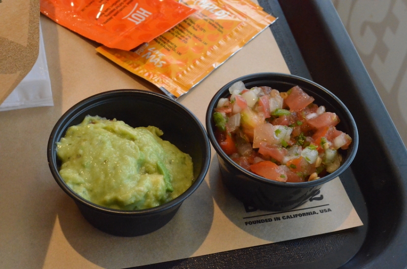 サイドメニューはポテトかナチョス(トルティーヤチップス)が選べます。アボカドのディップ「ワカモレ」とトマトのディップ「フィエスタサルサ」を追加しました(ディップは各100円)。