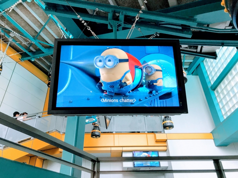 待ち時間にもミニオンの映像がずっと流れていたりするのも楽しいポイント。たくさんのミニオンと、映画にも出てくるアグネスたち3姉妹、そして怪盗グルーと一緒にハチャメチャな旅ができる、そんな楽しいライドです。