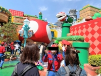 写真:WriterA まずは「コイン100枚」を目指して頑張ろう! |  写真:WriterA ゲストに「フォト・オポチュニティ」の流れの説明をしているクルーの様子 |  写真:WriterA スーパー・ニンテンドー・ワールドのグリーティング購入写真 |