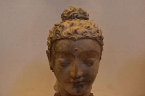 こちらはガンダーラ王国の遺物です。パキスタン北西部に位置したガンダーラはヘレニズム文化を取り入れ、お釈迦様の姿にもその彫刻技法が用いられるなどし、後の中国や日本にもその影響をもたらしています。