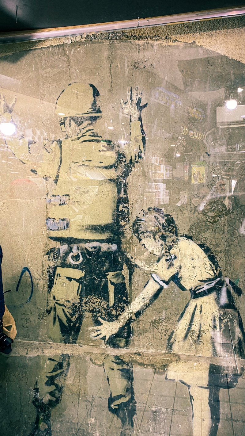 本来はボディチェックをするはずの兵士と、されるはずの少女が逆の立場となった作品。イスラエルのパレスチナに対する抑圧への批判や皮肉が垣間見える作品です。こちらの作品は土産物店の内部にあるため、建物の中に入ると見ることができます。