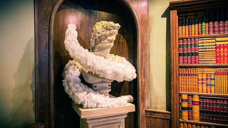 催涙ガスが出ているため、マスクをしなければならなくなった胸像。こちらも THE WALLED OFF HOTELのロビーに展示されている作品です。パレスチナの人々がイスラエルに対してデモなどを行った際に、イスラエル軍が催涙ガスを使用して鎮圧してることを想起させる作品です。