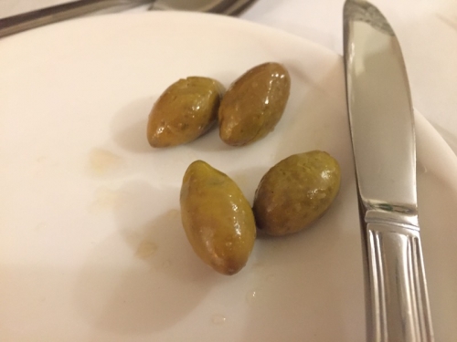テーブルには容器が置かれており、中にはおつまみのオリーブが入っています。オリーブのおつまみはイスラエル料理でも馴染みのあるスタイルです。