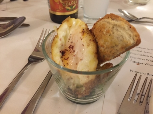 アミューズブッシュ(一口サイズのオードブル)は3品で、それぞれ簡単に説明すると、1: ザアタル入りのパン、2: タパス/ブルスケッタ、3: スマック入りの目玉焼きです。