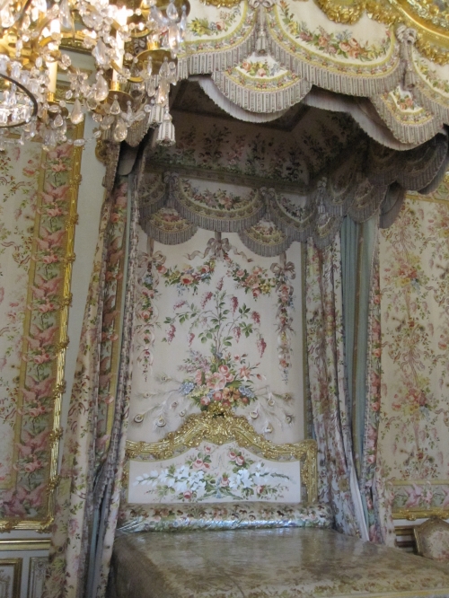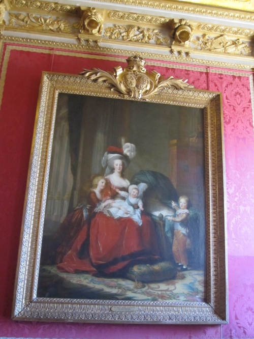 ルイ16世に嫁いだマリーアントワネットもこのヴェルサイユ宮殿に暮らしていたことで有名です。マリーアントワネットと子供達を描いた肖像画が飾られています。そして写真右下、歴代王妃が使った寝室では、マリーアントワネットが使用していた時の装飾が再現されています。