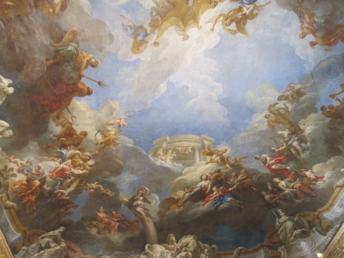 内部も目がくらむような豪華さです。写真左下は「ヘラクレスの間」の巨大天井画で、ルイ14世時代の最高傑作と言われています。そして最大の見所は「鏡の回廊」。中は壁一面に357枚もの鏡が張り込まれた回廊になっており、煌びやかな世界に圧倒されます。