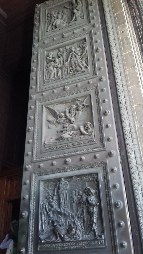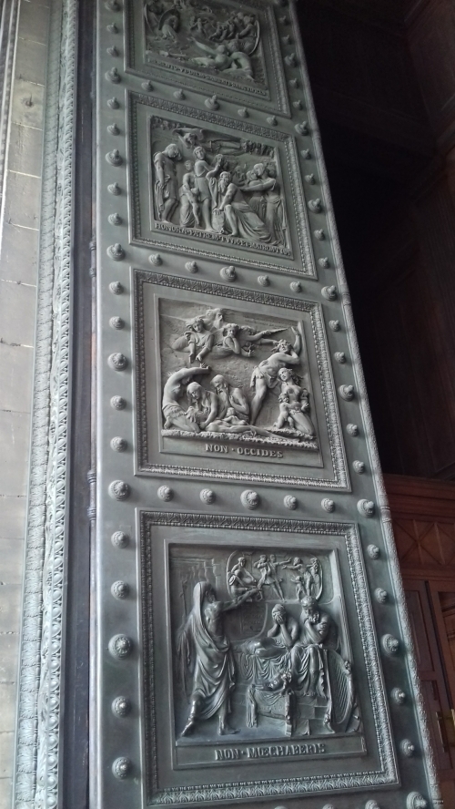 正面のファザード上部にはアンリ・ルメール作の『最後の審判』が彫刻され、扉にはアンリ・ド・トリケッティ作『十戒』をモチーフにしたレリーフが施されています。