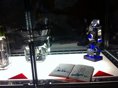 バカラの素晴らしい彫刻や装飾技術を用いて製造された、各国政府や王室からの注文を受けた豪華な特注品や、Diorやココシャネルがデザインしてバカラの技術で出来上がった美しい香水瓶などが、オリジナルのデザイン画と共に展示されています。