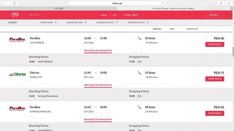 イカ行きのバスチケットを購入するには、バス会社に行き直接購入するか、red busというサイトで購入する方法があります。このサイトでは、ペルーを走っているほとんどのバスを検索、クレジットカード等でチケットを購入できますが、これから紹介するのは直接バス会社で買う方法です。