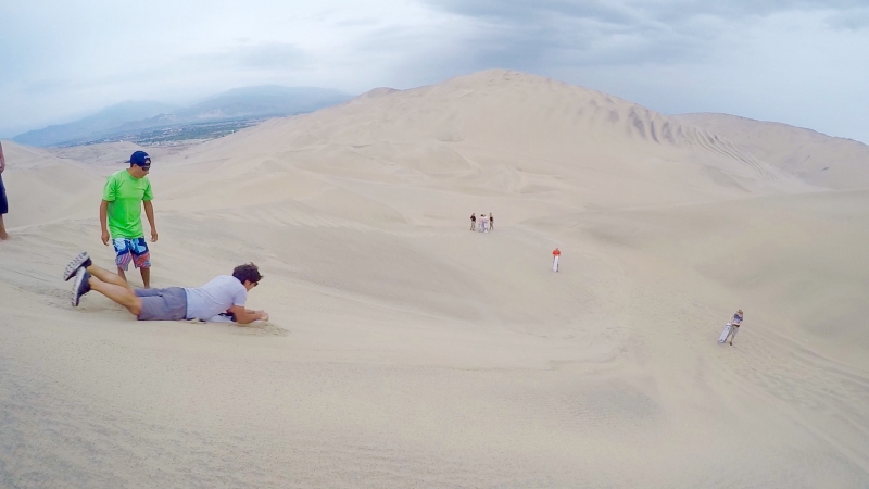 角度の急な砂丘をサンドボードで滑り下りるのは、スリリングで爽快な気分になります。