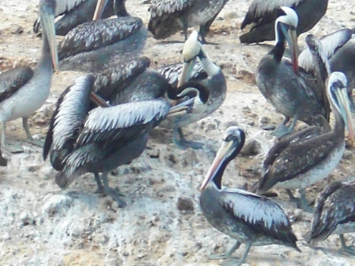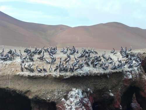 でもこれ、陸が黒いのではなく、岩場に多くの鳥が居るんです。これらの鳥たちは、ペルーペリカン(Pelecanus thagus)、ペルーカツオドリ(Sula variegata)、グアナイ鵜(Phalacrocorax bougainvillii)、インカアジサシ(Larosterna inca)などの海鳥たち。