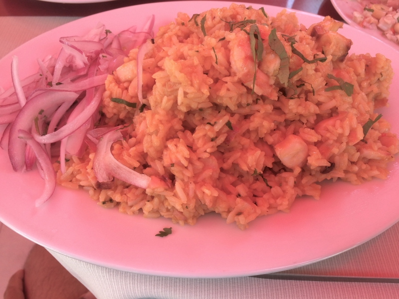 こちらのおすすめ料理はアロスコンマリスコスです。アロスコンマリスコスとは、ペルー発祥の料理で、今では他の南米でもみられます。