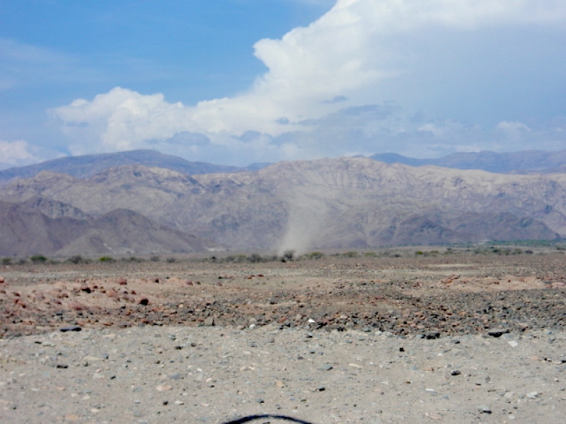 先ほども紹介した通り、この砂漠地帯の表面は黒い礫岩で覆われています。そこに太陽の光が当たると黒い石から熱が発生し、その熱風が つむじ風 になる…というわけです。乾燥地帯なので雨も降らない。つむじ風が頻繁に起こるので、それが “ほうき” のような役割になってラインを保っているんだそう。現地に訪れたら、そのつむじ風を1日に何度も見ることができると思います。